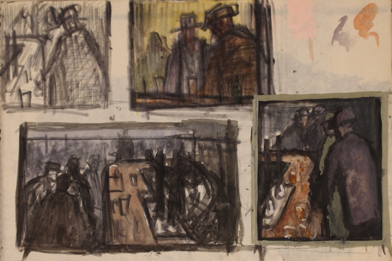 The sketch books also contain letters and personal observations about a wide range of contemporary topics. Norman often said that painting was like an itch that had to be scratched. Rarely can one town and its people have received so much attention from an individual artist with almost 5,000 drawings and watercolours, some of which will be reproduced in the forthcoming book. He worked on themes repeatedly and almost obsessively, wrestling in his mind to find a faultless composition. Many of his themes can be seen running through different seasons and times of the day and night.