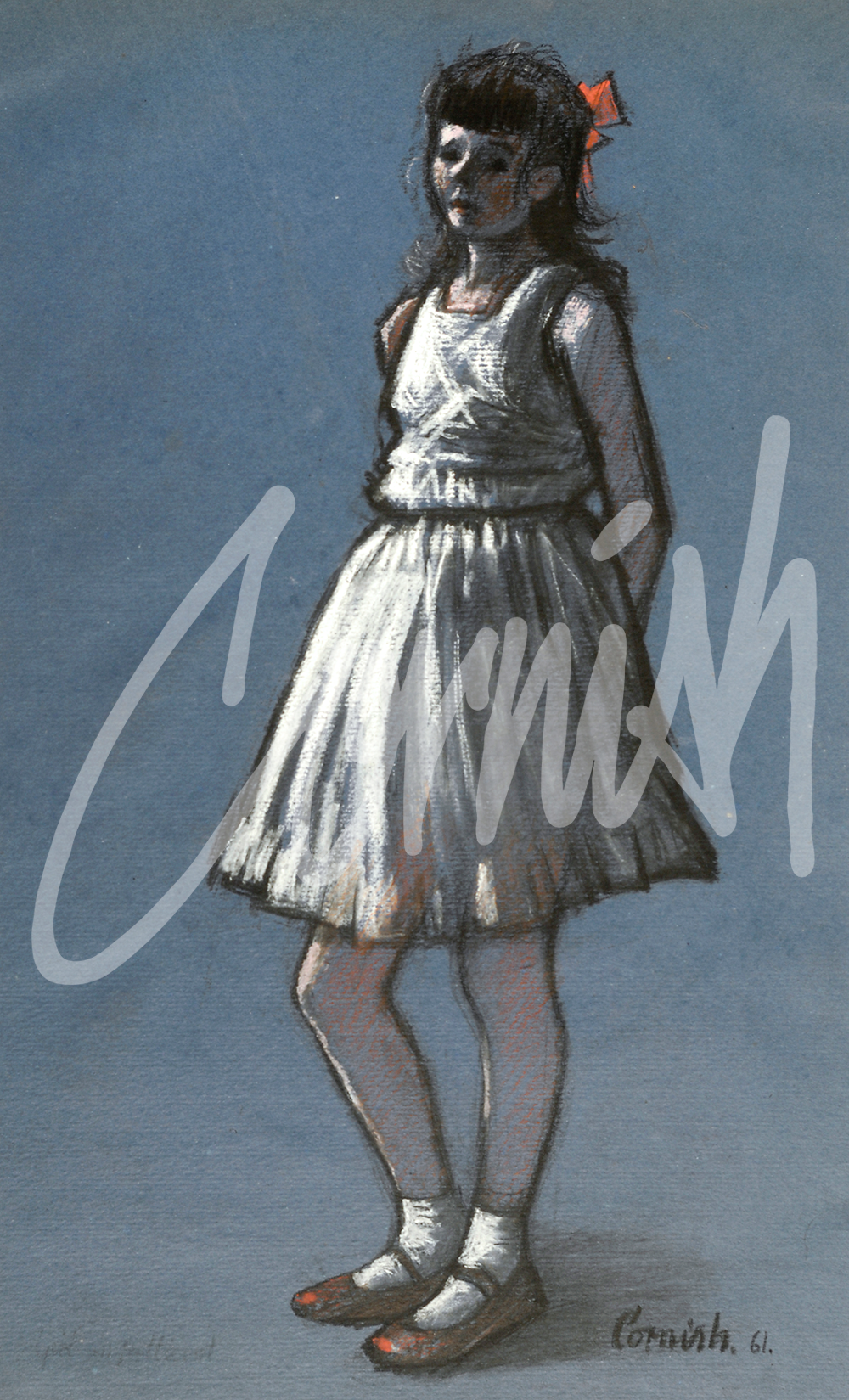 A print by Degas – Combing the Hair, used to hang on the wall outside of Norman’s studio at Whitworth Terrace in Spennymoor. Inspired by Degas, the ‘dry media’ of charcoal, chalks and pastels became Norman’s favourite media in his portraits and some large works. By the age of twelve, Norman’s daughter Ann was accustomed to posing for her father in many different situations. Ann in Red Shoes.