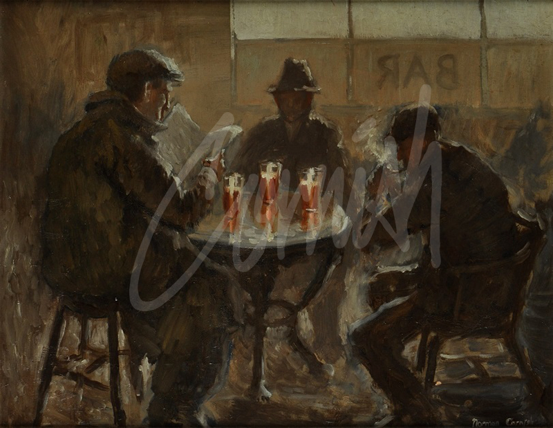 On January 16th 1952, Cornish exhibited, along with Herbert Dees and Robert Heslop, in the Crow’s Nest Hotel in the Haymarket, Newcastle. An unusual venue organised with the support of Newcastle Breweries Ltd. The Three Beers was singled out for particular attention by Ivan Geffen in his Evening Chronicle review as ‘the outstanding picture in the exhibition and the best picture by an amateur artist I have ever seen’. This painting is one of a series of bar scenes which Cornish re-visited throughout his career.