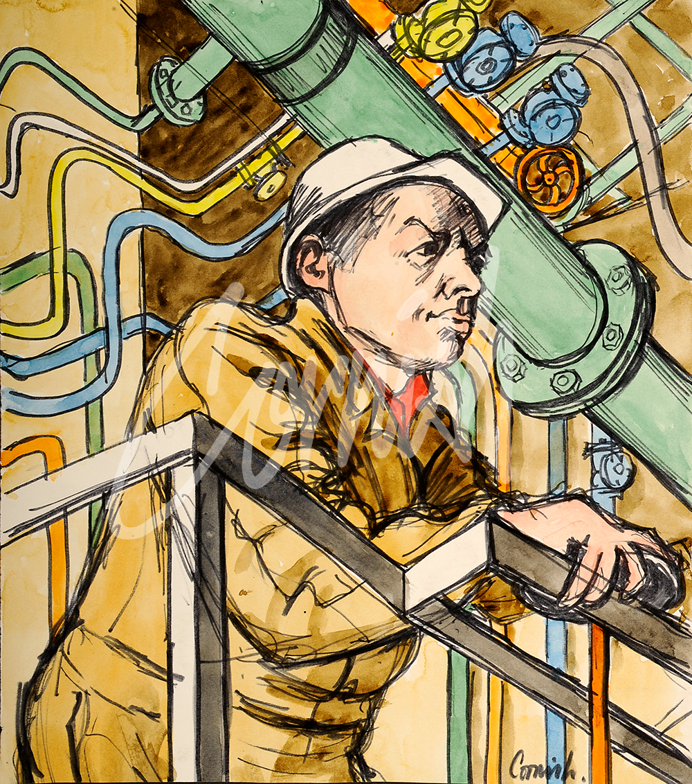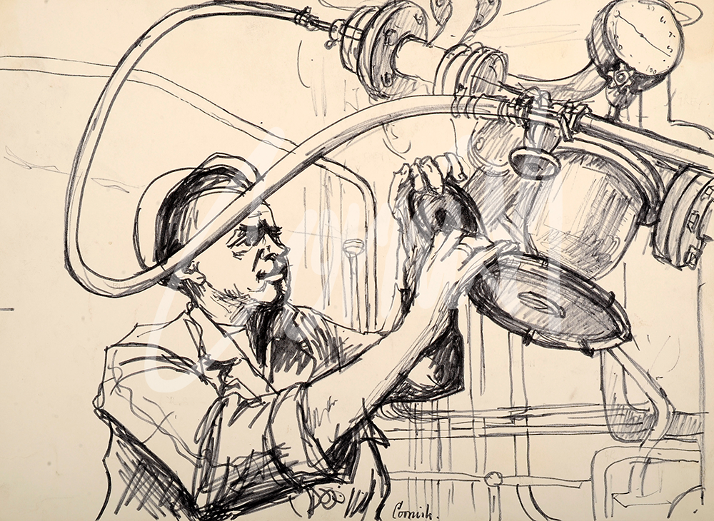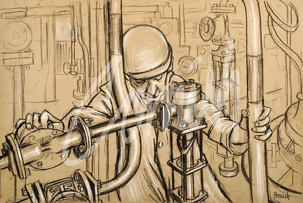One day, via his agent, Cornish received a commission from the British Oxygen Company based at Birtley. He was asked to portray the ‘humanity of their work’ and one of the employees was designated to escort him around the factory and pose as a model.