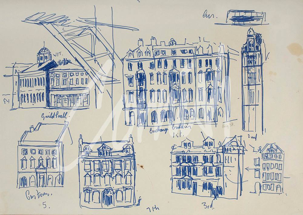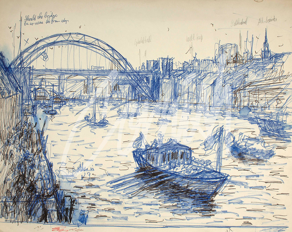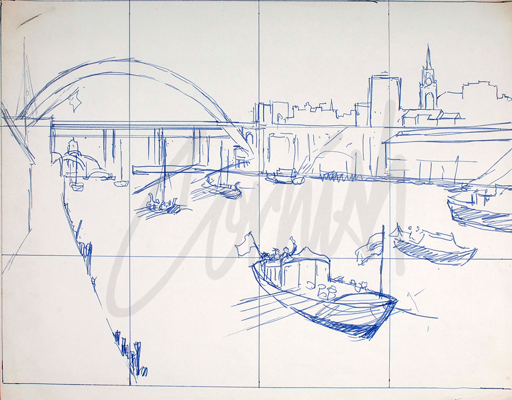It was essential during this commission that Cornish was able to paint a topographically correct cityscape with an accurate record of the architectural features of the quayside. Cornish once again undertook a number of visits to the riverside area to complete detailed drawings of the buildings. During the actual Pageant he had to work quickly to record the events on the river including the chairman Gordon Carr CBE waving from his vessel near the centre of the painting.