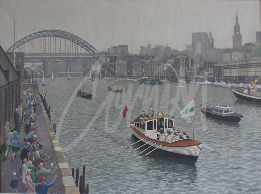 The Port of Tyne Authority was delighted with the outcome of the Ro Ro commission as it came to be known by the family of the chairman Gordon Carr CBE. Shortly after the painting was delivered to the HQ in Tyne Dock, Cornish received a direct, second commission, from The Port of Tyne Authority to record the River Tyne Pageant – a celebration of 900 years during the summer of 1980.