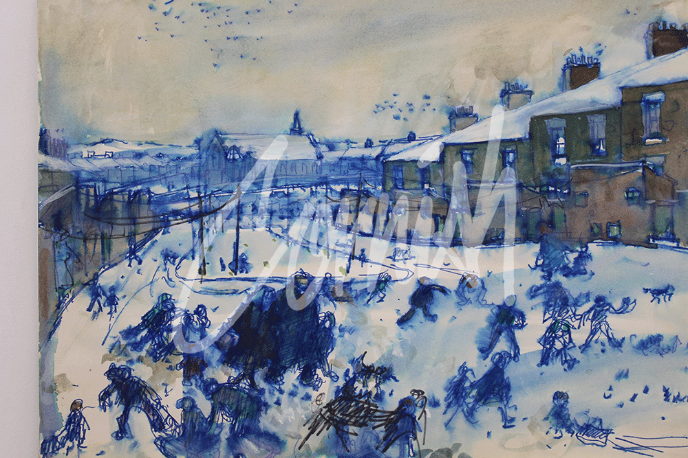 Throughout his career Cornish painted many different street scenes in and around the Spennymoor area. He often re-visited the same location on different occasions and at different times of the year carefully recording people at work and play. This piece of work may be interpreted as a genre scene (an image of daily life) which allows great insight into the daily cultural landscape with pictorial representation in a variety of media.