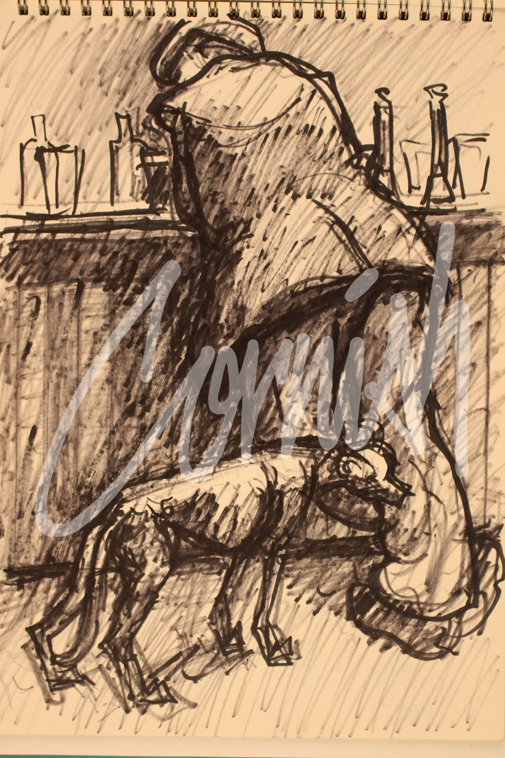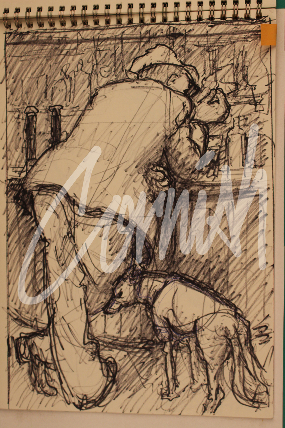 The Man at Bar with Dog appears in many other bar scenes and throughout Cornish’s sketchbooks. Further examples can be found in