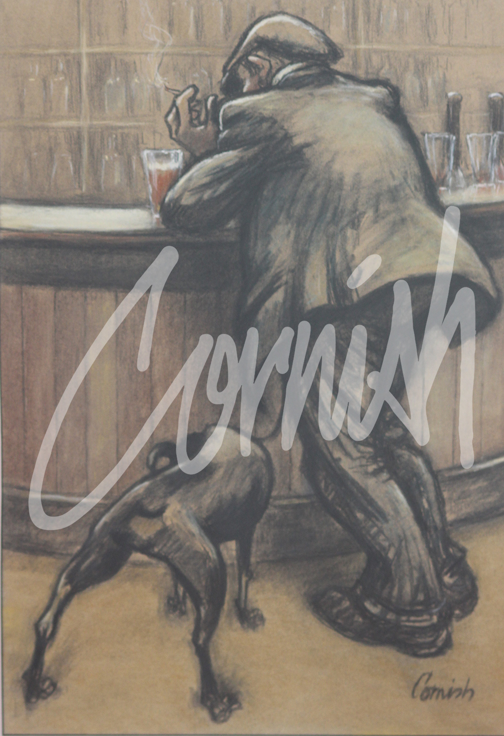 There were numerous versions completed throughout his career with minor adjustments to the position of the man at the bar, his arm on the bar, and various alignments of the dog’s head and legs. Constantly seeking the perfect composition almost became an obsession for Cornish. At Spennymoor Town Hall, Bob Abley Gallery, there is an hour long documentary (commissioned by Northumbria University many years ago) available to view. During the film, Cornish discusses his life and work with Richard Swallow who only manages four questions in an hour. However, in the visitors’ book, there is a delightful comment from someone who has enjoyed listening to Cornish talk about Man at Bar with Dog.