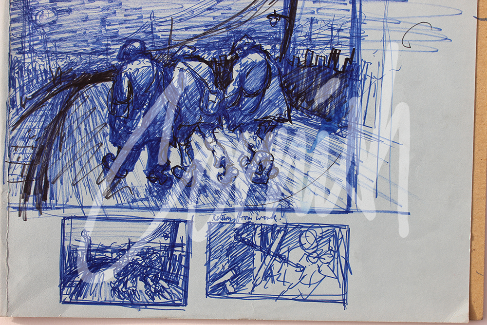 “After walking along this road, winter and summer, it naturally becomes a significant part of one’s life. To watch the man ahead of you plodding resignedly through this man- made world is a subject which demands to be drawn again and again.”