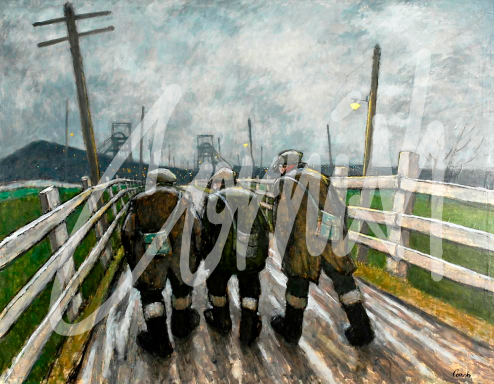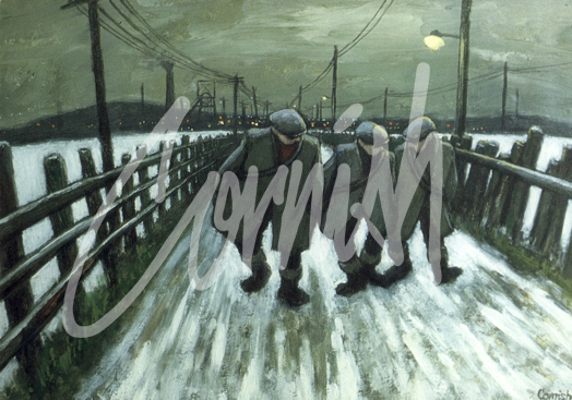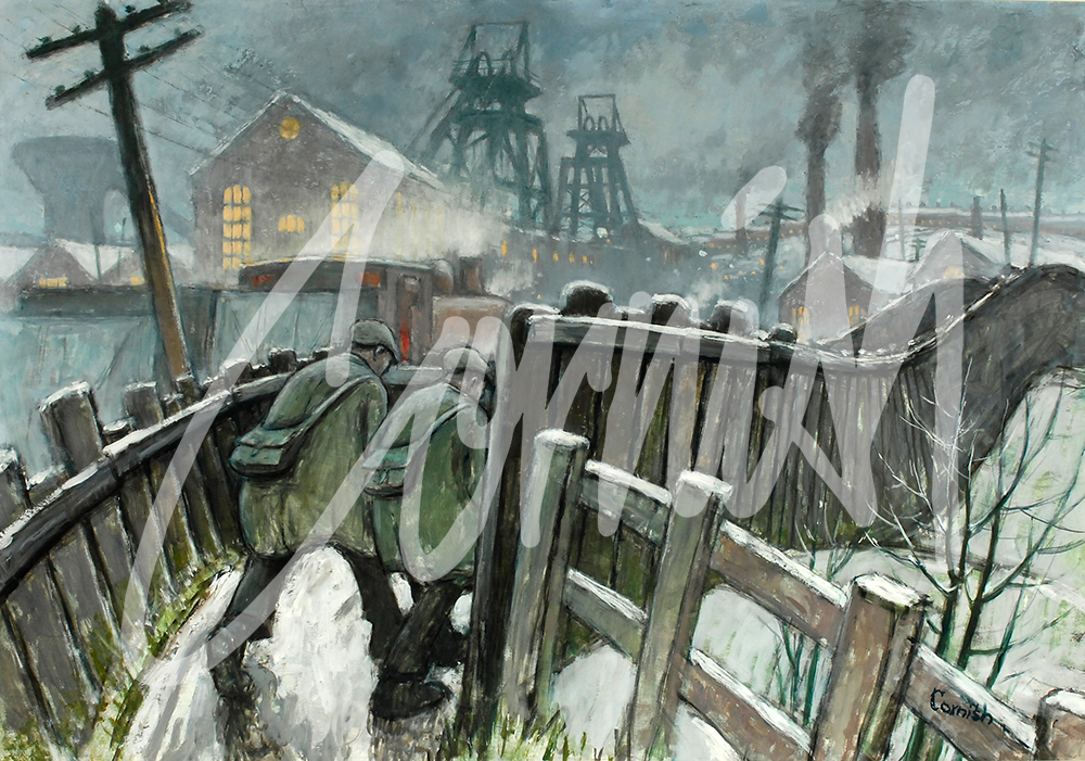The Pit Road is perhaps Cornish’s most iconic image, often repeated, with numerous variations throughout his career. Cornish started work on Boxing Day 1933 and walked the pit road every day for the next 30 years. The journey began as he left the front door of his home at Bishops Close Street and continued immediately through the tunnel under the railway line and onward to the pit. It was a journey of three miles each way, which he travelled along with hundreds of other men, in all weather conditions, and at different times of the night and day. Within five miles of Dean and Chapter Colliery there were some 135 collieries at various stages of working, closing and re-opening. The impact of the environment was pervasive.