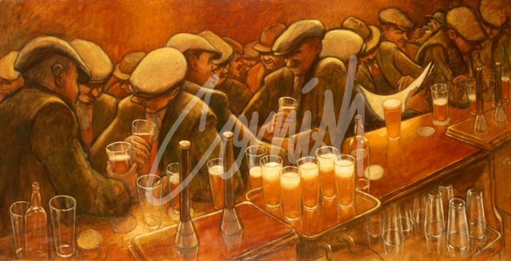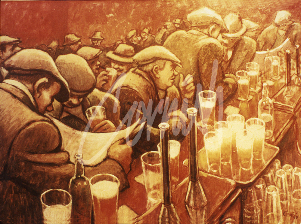 In 1989 The Busy Bar was purchased by Scottish & Newcastle Breweries to be hung in their boardroom. In 2007, the painting was donated to The Permanent Collection at Northumbria University and it forms part of the Norman Cornish: Definitive Collection at The Bowes Museum extended from August 1st to January 17th 2021.