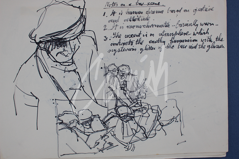 The scrap of paper revealed for the first time a preliminary rough sketch of a bar scene. More significantly, there were three statements setting out the underlying principles which Cornish employed to develop the composition of The Busy Bar, which became one of his most admired and appreciated paintings.