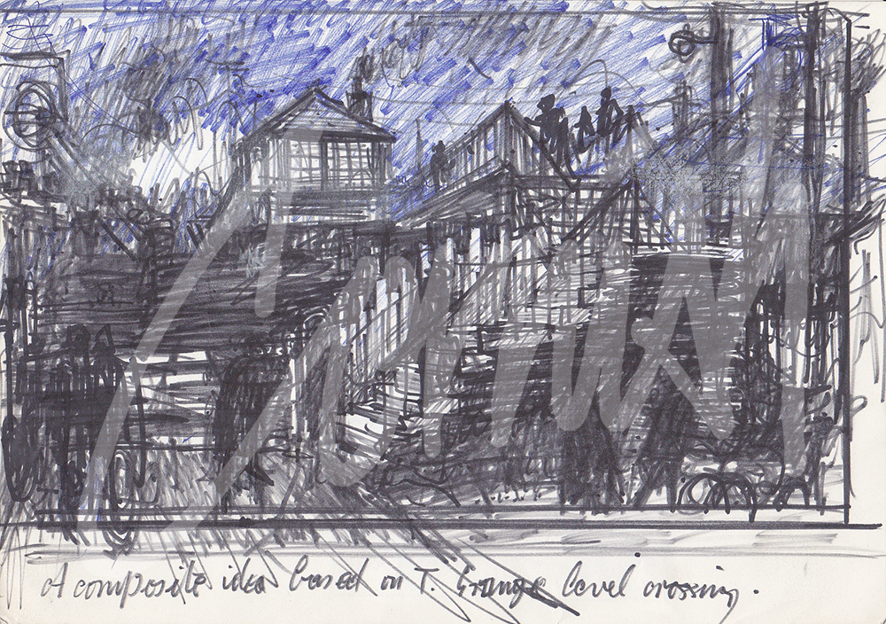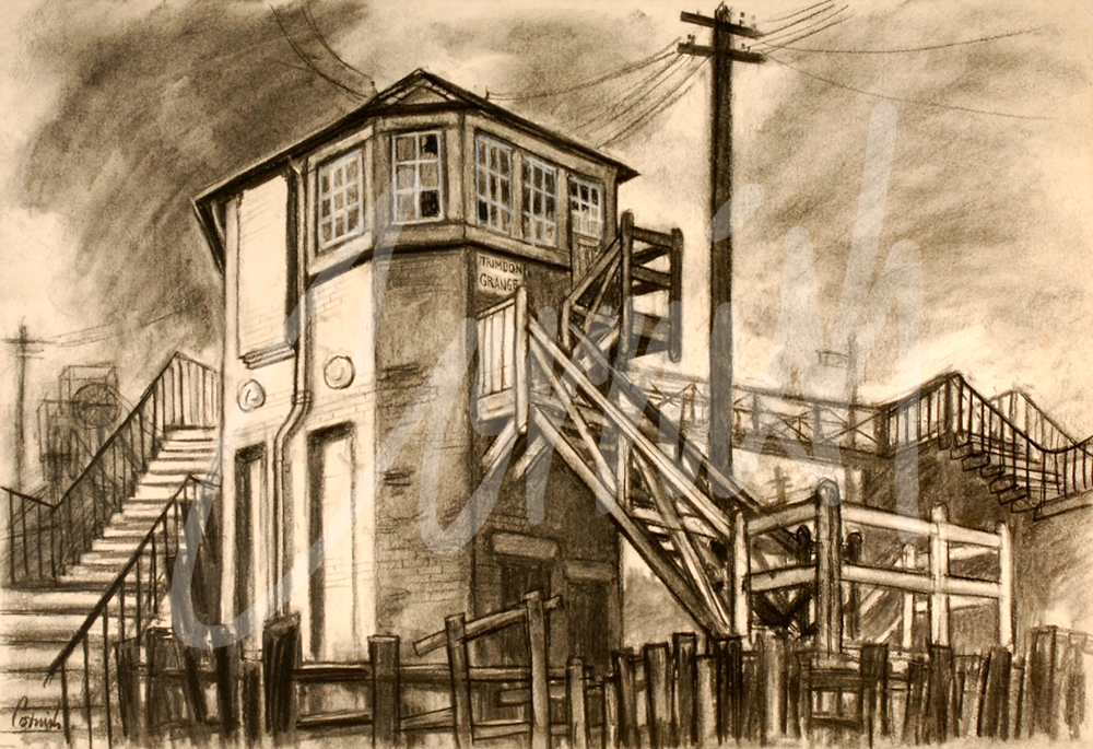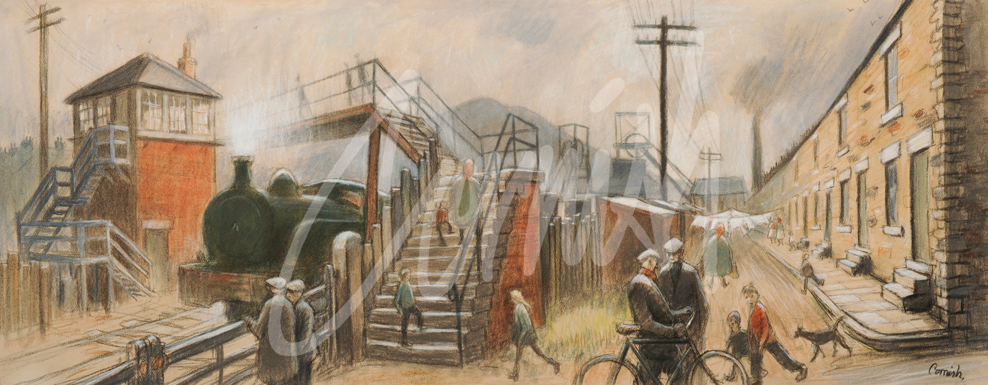 Coal mines in every town and village had connecting railway lines to transport the coal to coastal ports such as Tyne Dock. Level crossings, which still exist today on some railway lines, were a feature in many parts of the county. Whenever a locomotive hauling dozens of coal trucks was on the move the level crossing gates would close to traffic to enable safe movement. Cornish travelled to Trimdon from Spennymoor on the TMS (Trimdon Motor Services) and on many occasions the bus would have to stop at the Trimdon Grange level crossing and, waiting patiently, Cornish would take out his sketchbook and pen to capture this moment in time. The scene showing the level crossing, steam train, terraced houses and folks going about their daily lives is typical of scenes throughout County Durham in this particular slice of life.