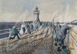 The south pier at South Shields is 1,570metres long and combines the interesting curvature of the feature, along with the rail lines used in the construction of the pier in 1854. The anglers watching and waiting after casting their lines, were irresistible to Cornish, and the subject became a favourite that also offered what he considered as “a different theatre of operations.”