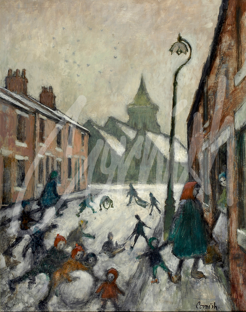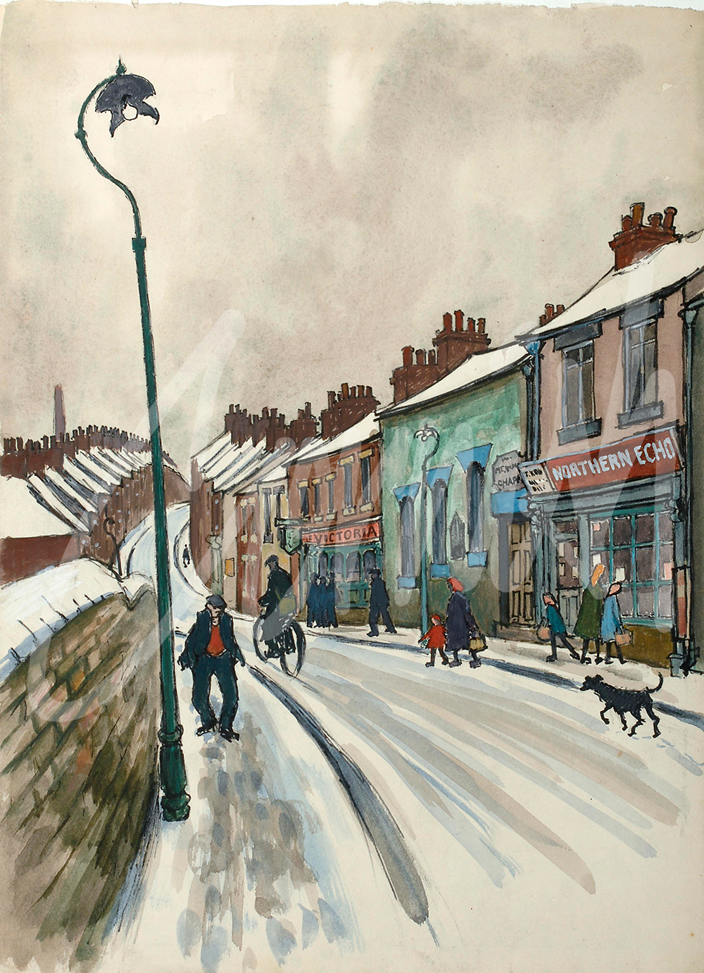 Winter conditions can vary considerably but when snow arrived in Spennymoor the opportunity for Cornish to re-visit his favourite street scenes was irresistible. These examples may be interpreted as genre scenes (images of daily life) which allow great insight into the daily cultural landscape with pictorial representation in a variety of media.