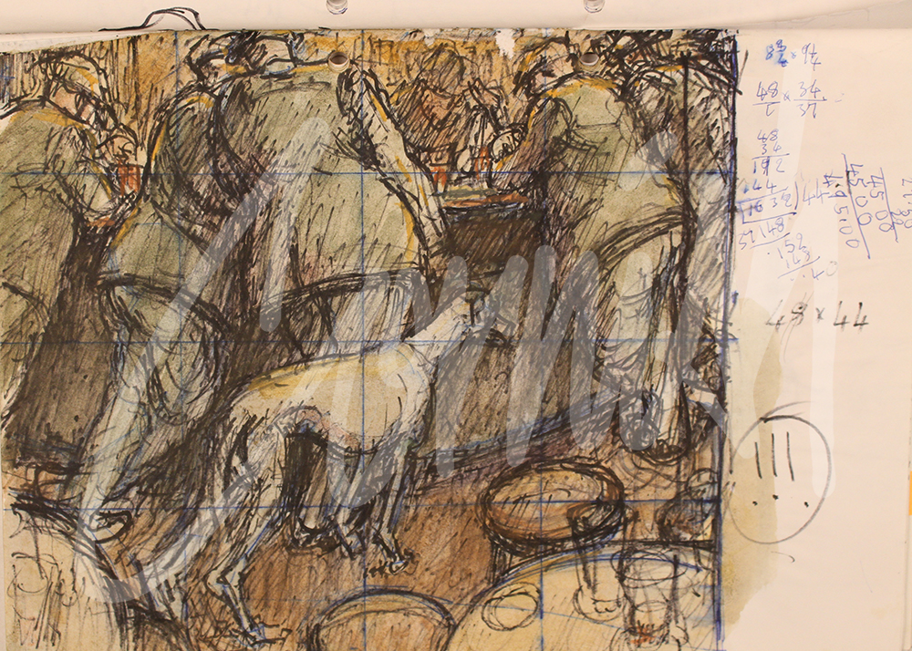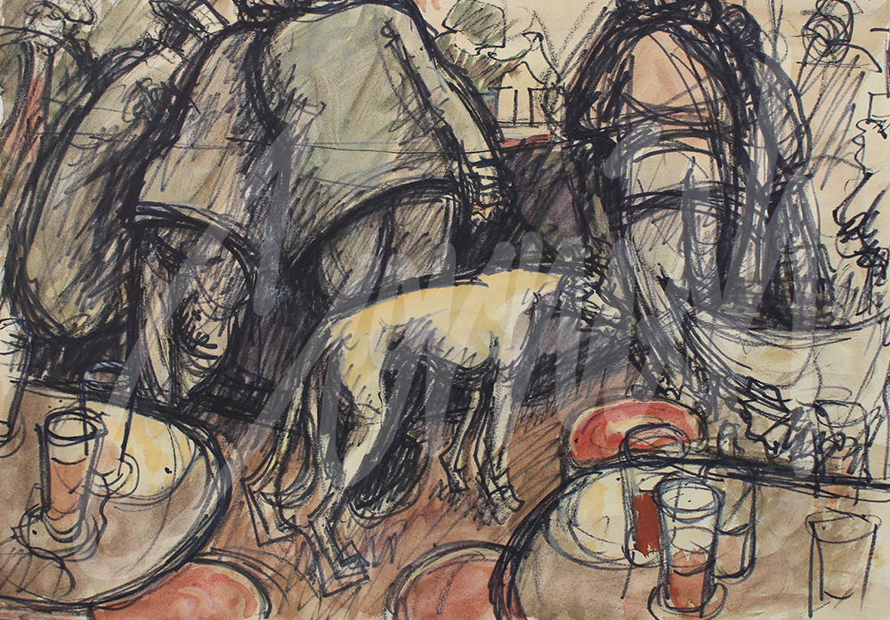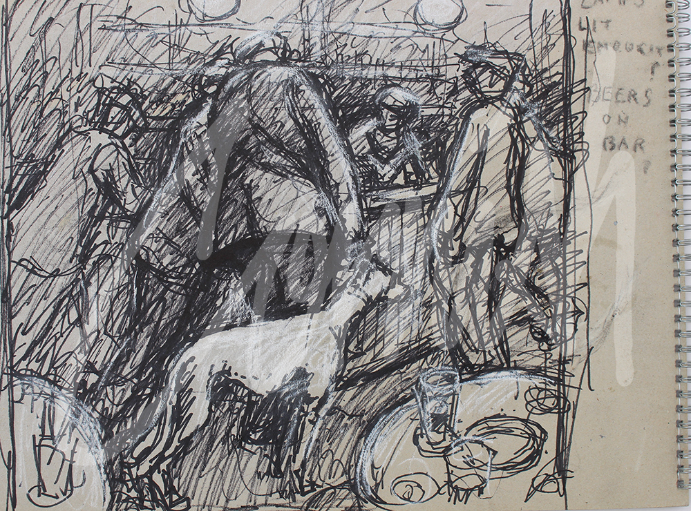 With each version his thinking can be observed with subtle changes such as the link between a newspaper and the shape of the man at the bar, the juxtaposition of the tables at the front of the picture, the position and angle of the dog’s head and finally the introduction of the man arching his back with hands in pockets. During the process a grid was also superimposed onto the picture to enable scaling up to a much larger canvas.