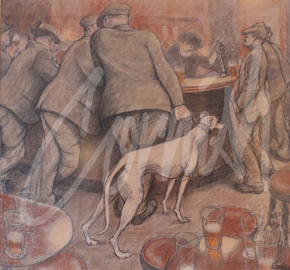 The creative process for Cornish was a highly sophisticated exercise in draughtsmanship. He would consider the relationship between the body shapes, creases in the trousers, position of characters at the bar and the introduction of additional characters such as a barmaid to complete a composition. Even the location of the pint glasses and quantity of beer in each glass is adjusted to ‘fine tune’ the finished lay-out.