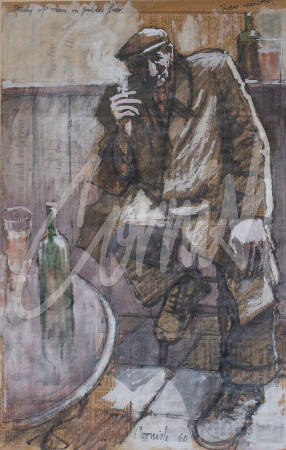 The solo exhibitions were also very successful and the mixed exhibitions attracted many visitors in the days prior to exposure on TV and before the internet. Without a telephone, contact from his agent was by post and a recurring theme from the many letters in the archive was the pressure he was under to take the big step from being a miner to becoming a professional artist which eventually happened in 1966.The Marshall’s also acted as agents for Lowry who was to purchase two of Cornish’s paintings. Another prominent collector was Prime Minister Ted Heath who also purchased two works by Cornish, one of which was a classic Man at Bar. During one visit to the Stone Gallery by Ted Heath, Cornish declined a group photo opportunity by Brian Forbes (film producer) which would have included Sheila Fell and LS Lowry. Cornish was delighted his work would hang in number 10, but equally nervous to appear in a newspaper alongside the PM!