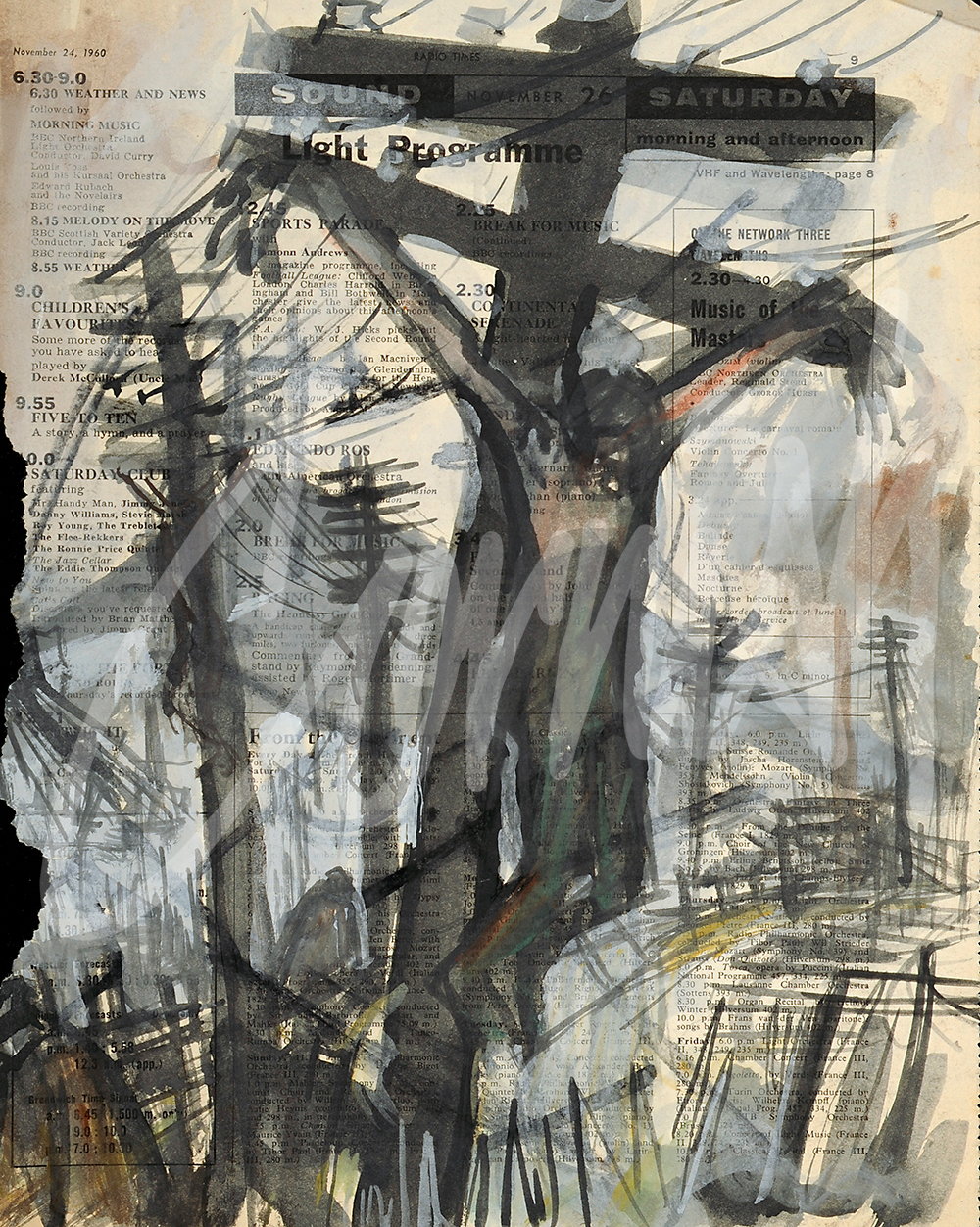 Cornish’s work has been described as genre painting, social realism and impressionist, with expressionist tendencies, but the labels become irrelevant when there is honesty and emotion in his depiction of everyday life in mining communities. There are also examples of symbolism where his feelings about the experience of miners are represented by his depiction of a crucifixion, as his emotions evolved from his shared experiences of being ‘treated like slaves,’ and ‘spoken to like convicts.’ His depiction of a crucifixion was quickly drawn and coloured onto a ripped sheet of the Radio Times (1960), probably during a period of high emotion, mental anguish and deep frustration.
