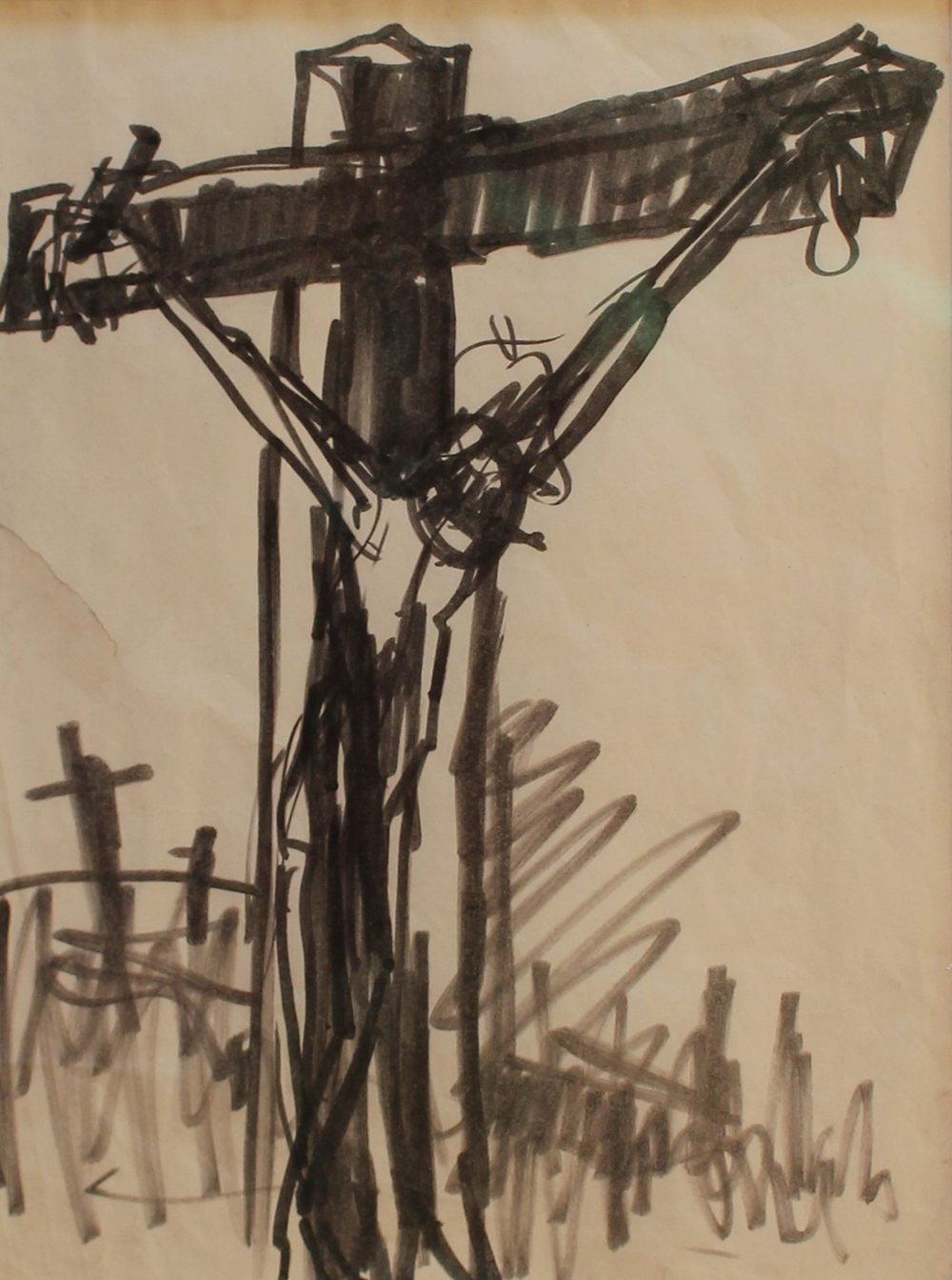 In his own words: “Suddenly, the man comes to a telegraph pole, it leans menacingly above him. It is an arm holding up many voices, He now also looks like a crucifix, and serves to remind him somehow of the price that man pays for his apprenticeship. Mankind has to suffer many accidents in his quest for technical miracles.”