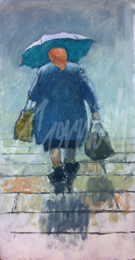 In his own words: On a wet day in Spennymoor, waiting for a bus and talking about Spennymoor and painting, he looks at the queue, mostly young women; “Les parapluies, look at that petrol puddle on the road. Pure Renoir.”