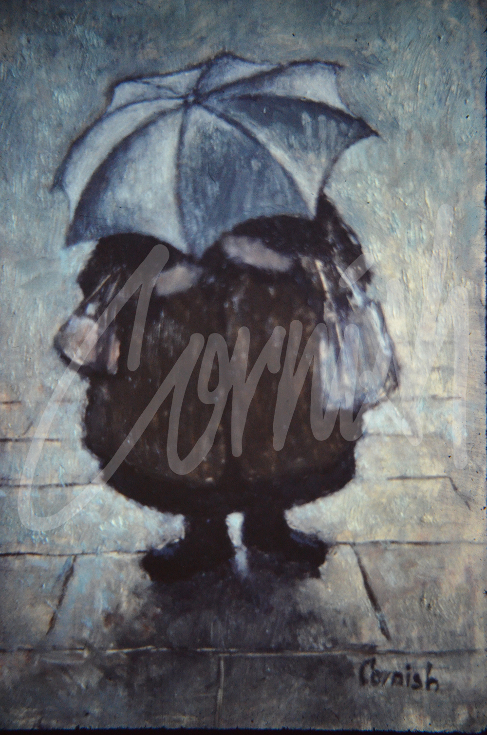 The pointed shape is actually the steeple of St Mark’s Methodist Church at the roadside and a short distance from the Shipley Art Gallery. Cornish’s fascination with the shapes of umbrellas, their owners and the many different occasions and situations which provided inspiration for him, is very well represented in ‘Behind The Scenes :The Norman Cornish Sketchbooks,’ where 16 examples are included in the section about observations of people, including preliminary sketches and completed paintings.