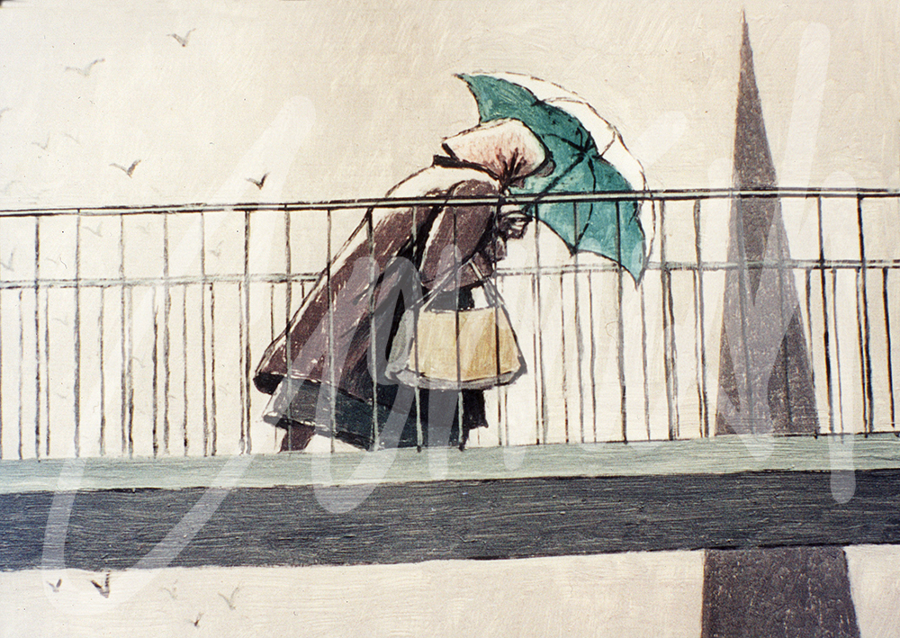 The journey by car always travelled along the A167, through Low Fell, past the junction for the Shipley Art Gallery and along Durham Road, whereupon, without exception, on every occasion, he would point out the location of one of his favourite paintings. The former pedestrian crossing, subsequently removed, was the subject showing a lady with an umbrella, struggling against the wind. Interestingly, there is a large and rather ominous pointed shape extending vertically at the side of the picture, simultaneously intersecting the horizontal lines of the pedestrian crossing and vertical lines of the railings.