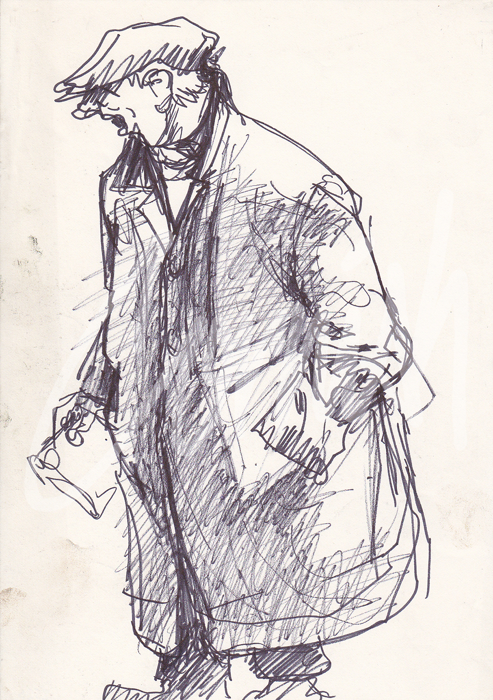 Funky Truman (Flo-master pen drawing) was one such character who plied his trade, along with his girlfriend, outside of the Mitre pub in Bishop Auckland. Some paper- sellers also worked on Theatre Corner, or near the market place next to the early bus stands and town hall. The drawing of Funky Truman was used as the basis for the painting on page 62 in ‘Behind the Scenes: The Norman Cornish Sketchbooks’ where other examples of these observations of people have been published.