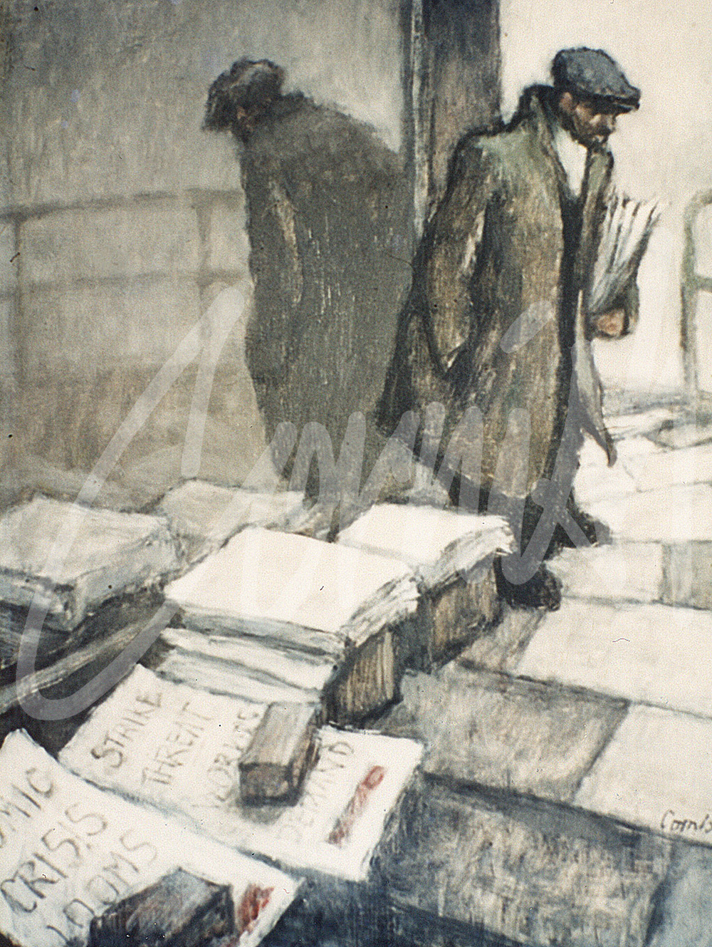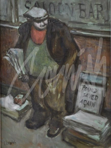 Paper -sellers (newspapers) were a common sight on the streets in towns and cities across the region and beyond. Cornish would often record the fact that piles of newspapers would be on the pavement, often weighted down by a brick or other heavy object. Many of his pictures also showed ‘billboards’ with headlines to catch the attention of passers-by. Busy locations in Bishop Auckland, Spennymoor, Durham and Newcastle near bus and rail stations were popular features of everyday life. The final versions of these pictures showed clear lines of composition and shapes, observing and recording a piece of social history, but developing into paintings where Cornish’s inborn instinct of line or colour is seen.