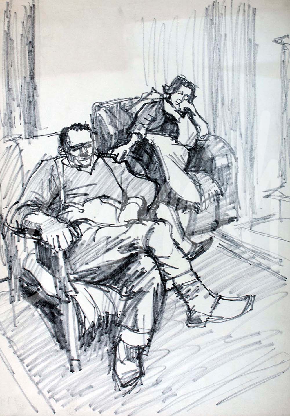 As his interest and skill in drawing developed, via the ‘Sketching Club’ at the Spennymoor Settlement, the advice from Bill Farrell to draw and paint what he knew became more significant and in his own words: ‘ Most of the members were steeped in landscape tradition but I’d rather draw things I saw in my house, like my mother preparing a meal or my father washing after coming back from the pit’.