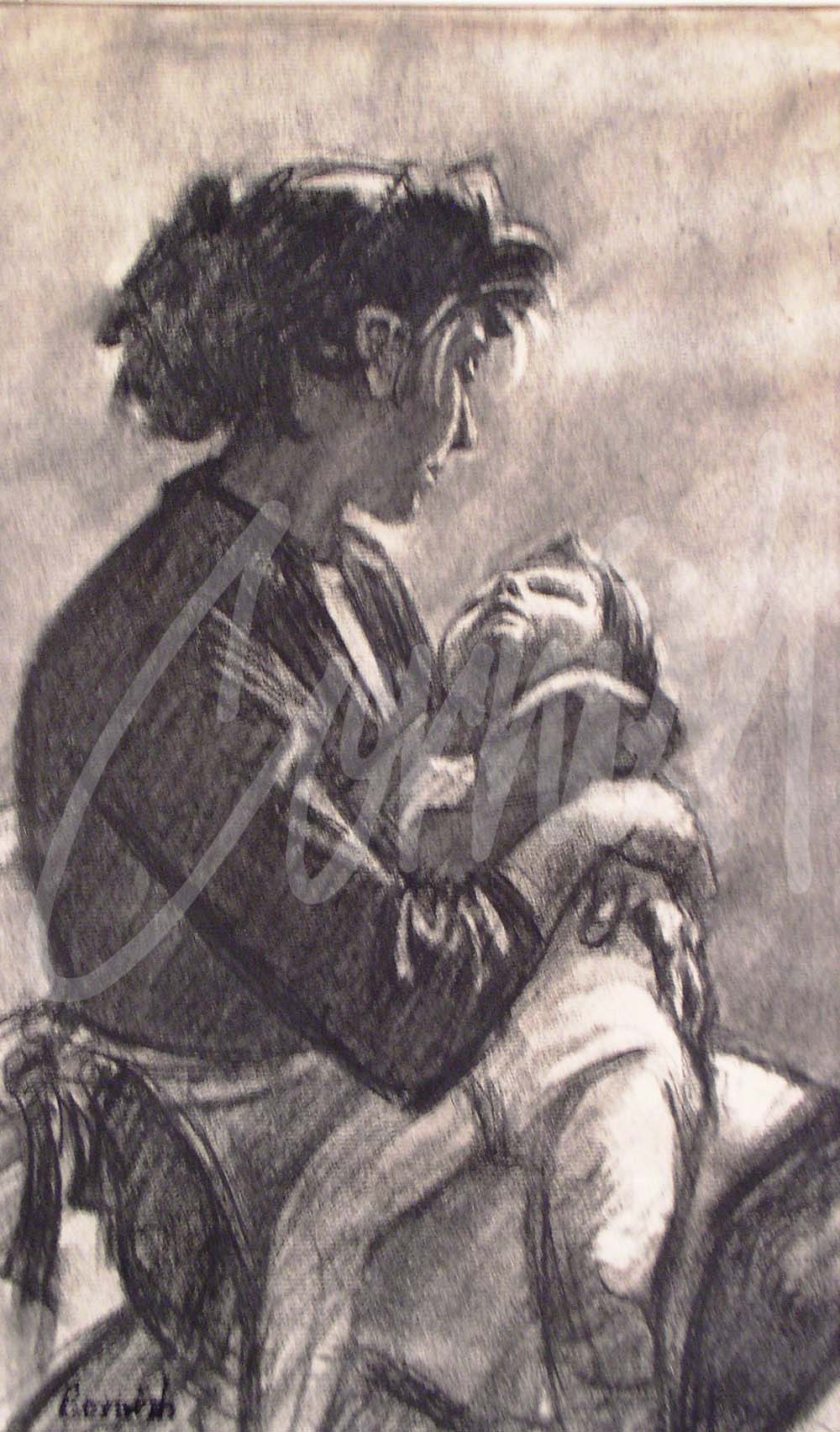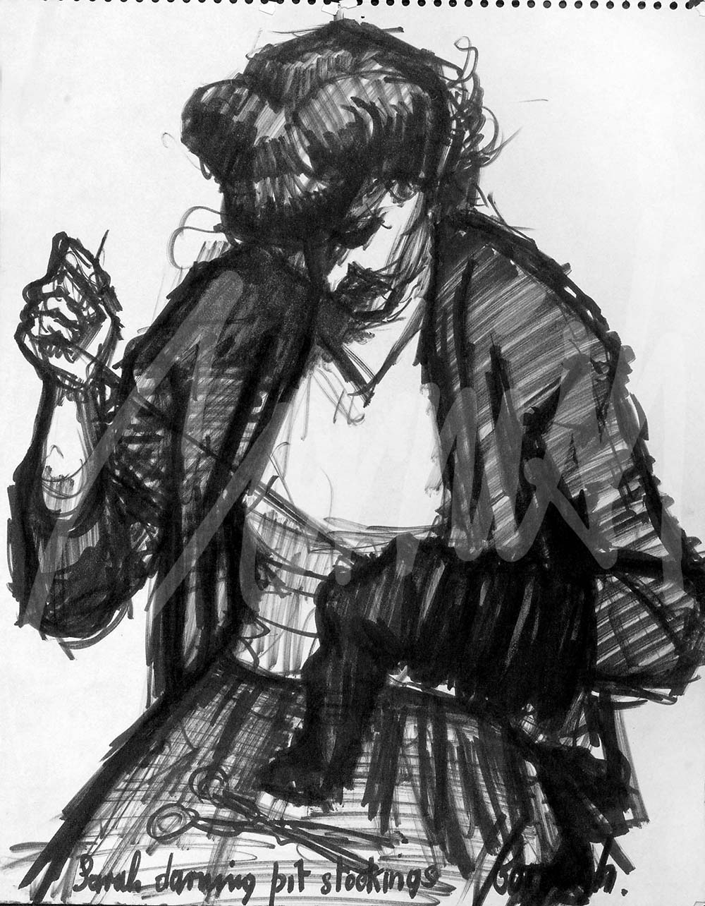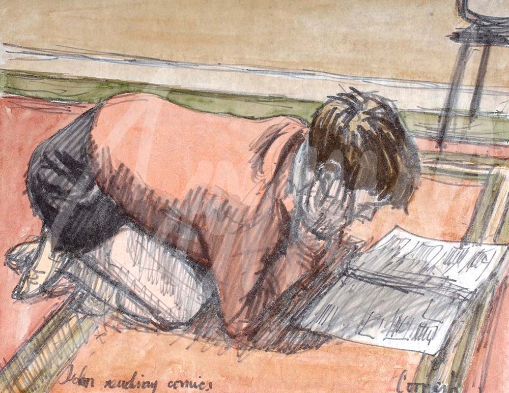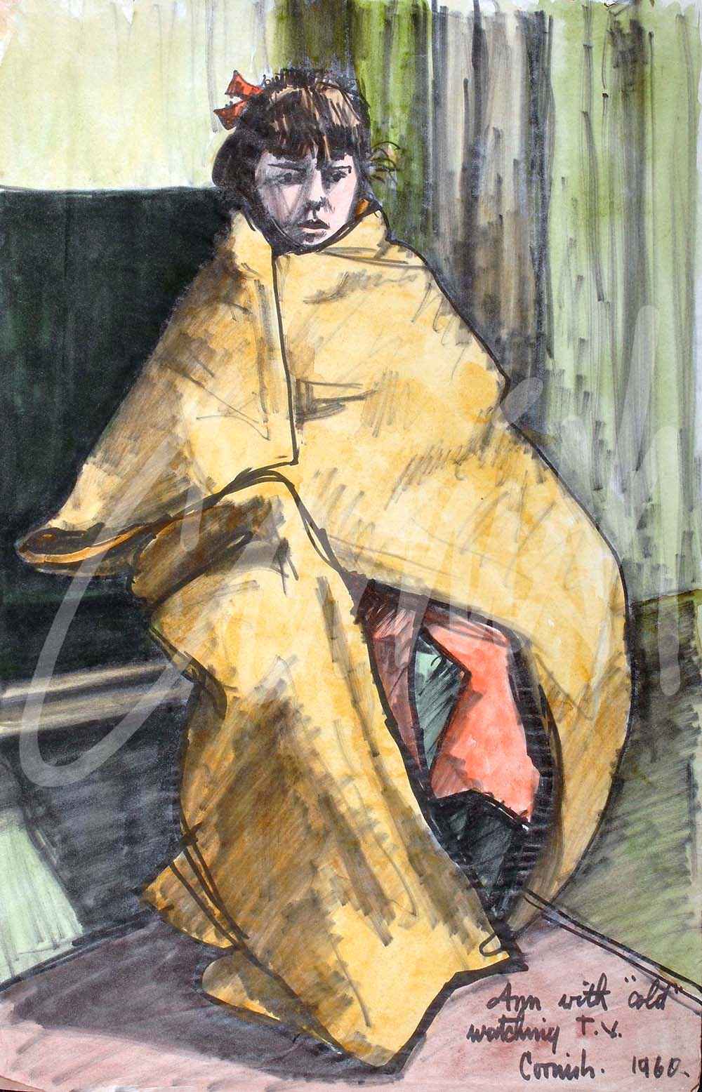 The drawings provide a remarkable record of the children growing up from childhood to later adolescence. Cornish observed all aspects of domestic life, the children doing their homework, drying their hair, or watching television. Moments snatched to the sound of ‘hold it there’ or ‘don’t move.’ John often commented that they didn’t have many childhood photographs but he and Ann were often featured in drawings in the household setting.