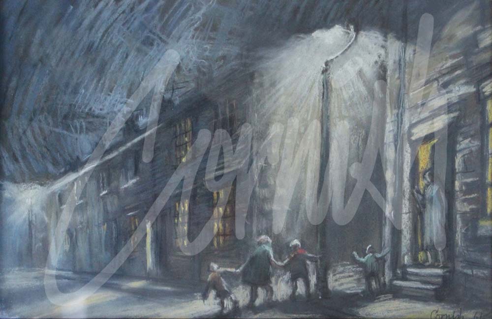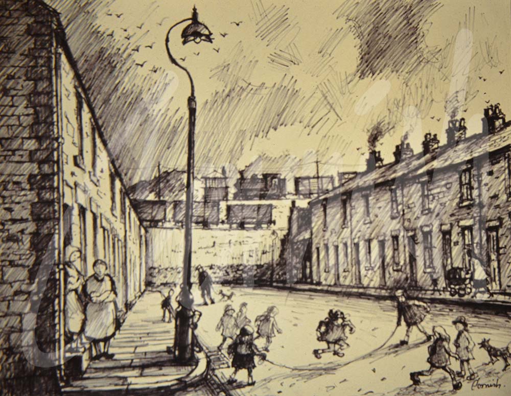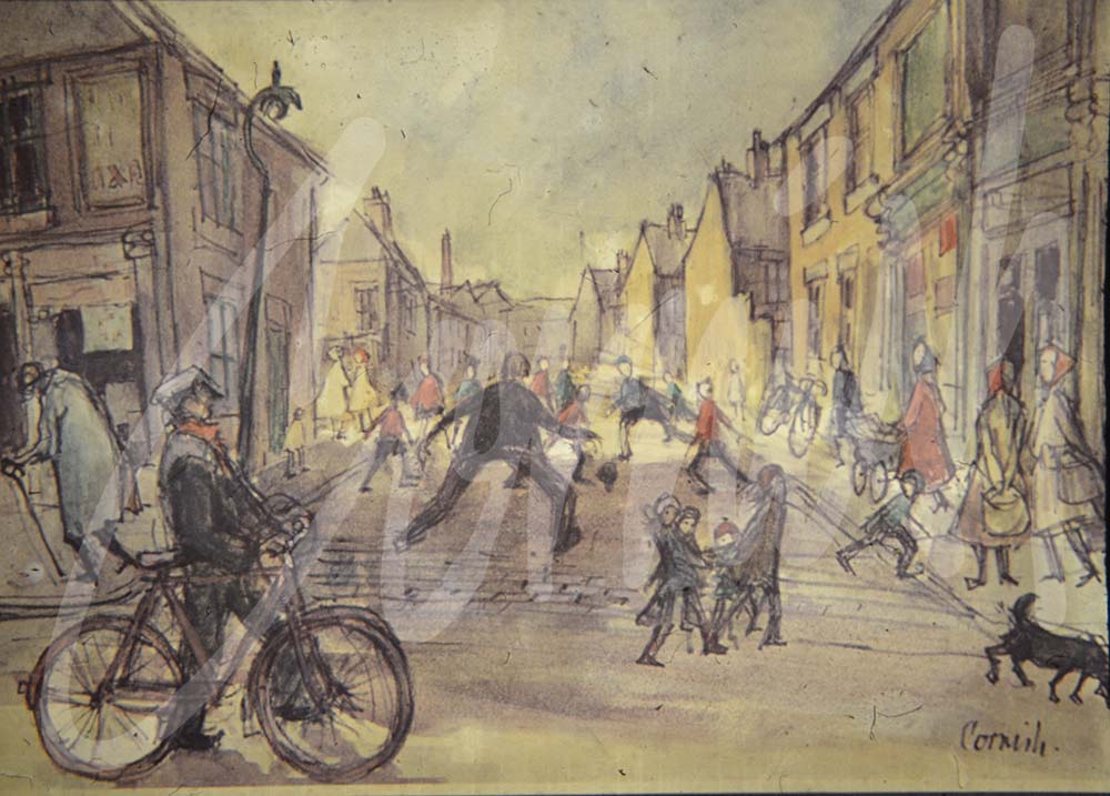 The safest place for children to ‘play out’ was the street, and not just in Bishops Close Street. With very few vehicles, some horse- drawn traders, and the ice-cream van on a Sunday. The streets became the playgrounds for ‘the bairns.’ For an artist advised early in his career to ‘paint the things around him’ the children ‘playing out’ at all times of the year was an obvious interesting subject.