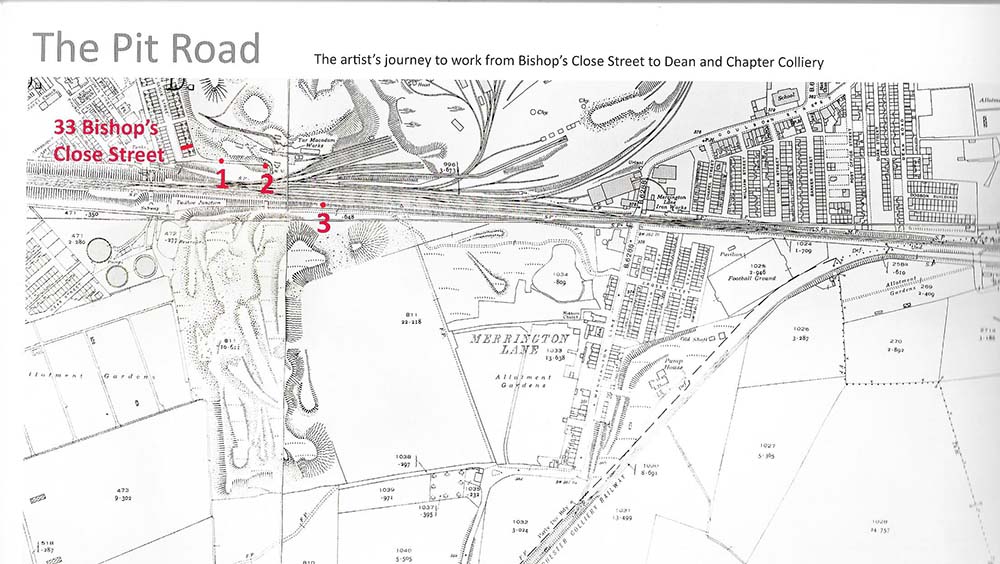 The featured map is an extract from ‘Behind The Scenes: The Norman Cornish Sketchbooks’ and shows the layout of rail tracks and the industrial landscape around Bishops Close Street, along with the beginning of the Pit Road to Dean and Chapter Colliery. There was a complex arrangement of tracks prior to the ‘Beeching Axe’ in the early 1960s which resulted in thousands of stations and railways being closed.