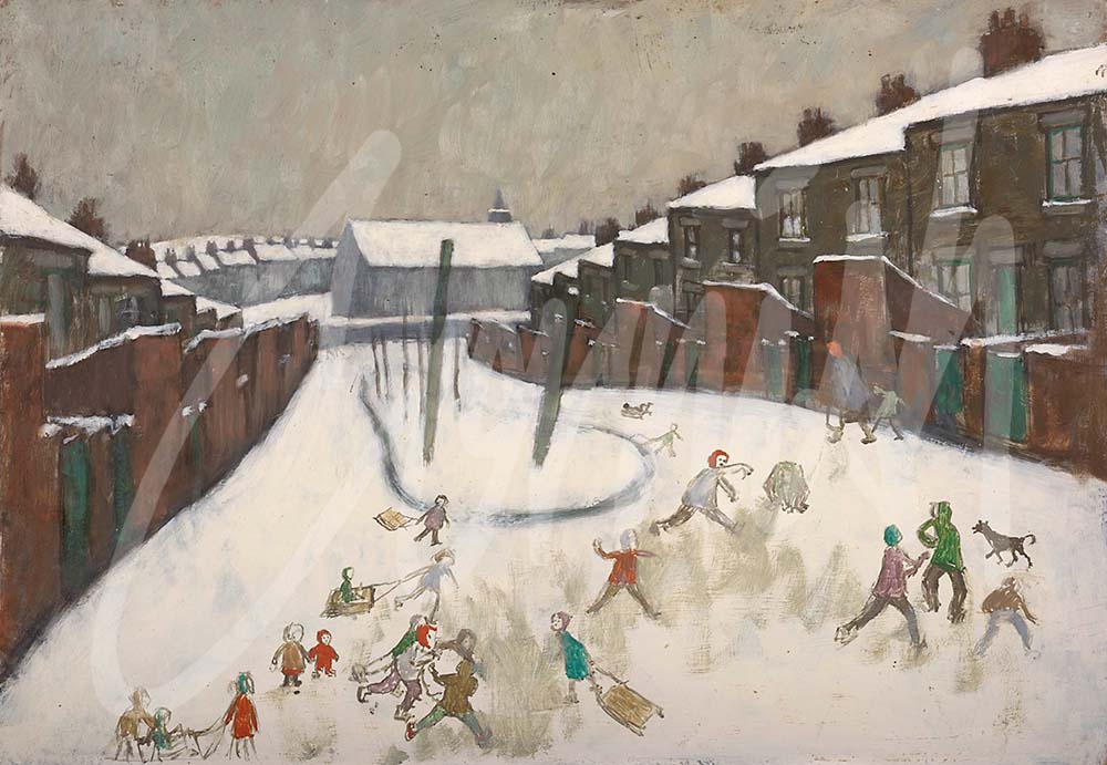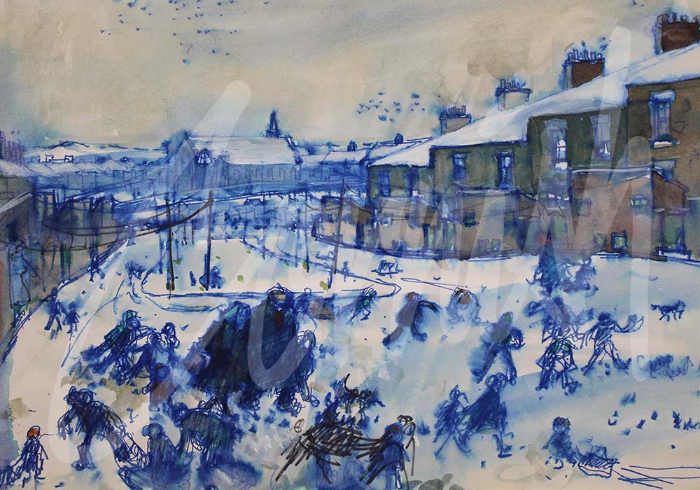 ‘Mount Pleasant in Winter’ is an excellent example of a popular subject which was a personal favourite of Cornish. The scene is featured in detail in ‘Behind the Scenes: The Norman Cornish Sketchbooks’ and it is accompanied by an account from Cornish regarding his thoughts about the composition and underlying concepts. The picture was also used by The Northern Echo to publicise their Christmas Magazine over 25 years ago and later, on the day of Cornish’s funeral, as a tribute, a full double- page spread in August 2014.