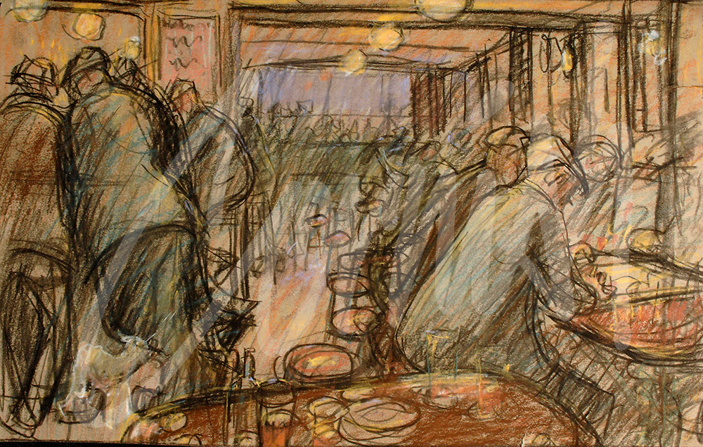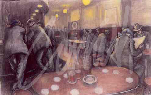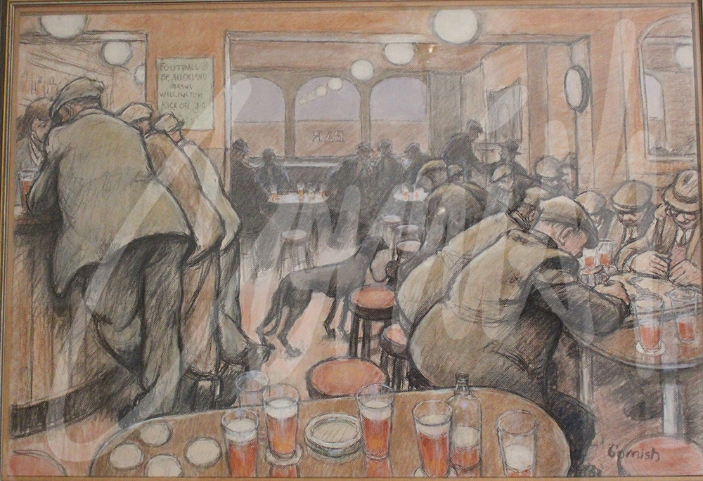 Finally, the rationale behind the classic composition with underlying principles was discovered written by Cornish on a scrap of paper in his studio. ‘Human drama based on gesture and attitude, monochromatic with the accent on atmosphere which contrasts the earthy humanism and mysterious glitter of the beer and the glasses.’ This just about sums it up !
