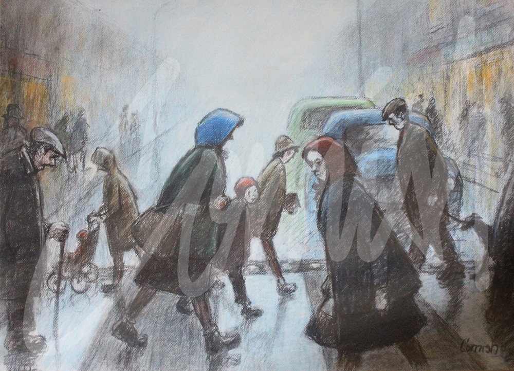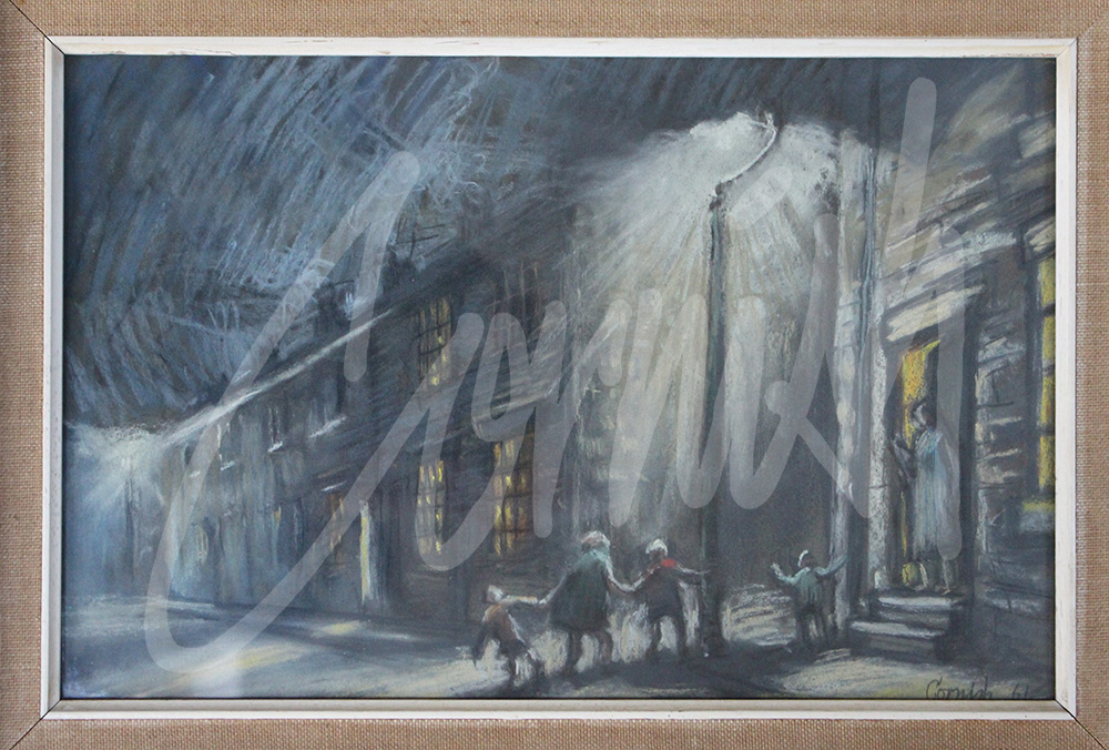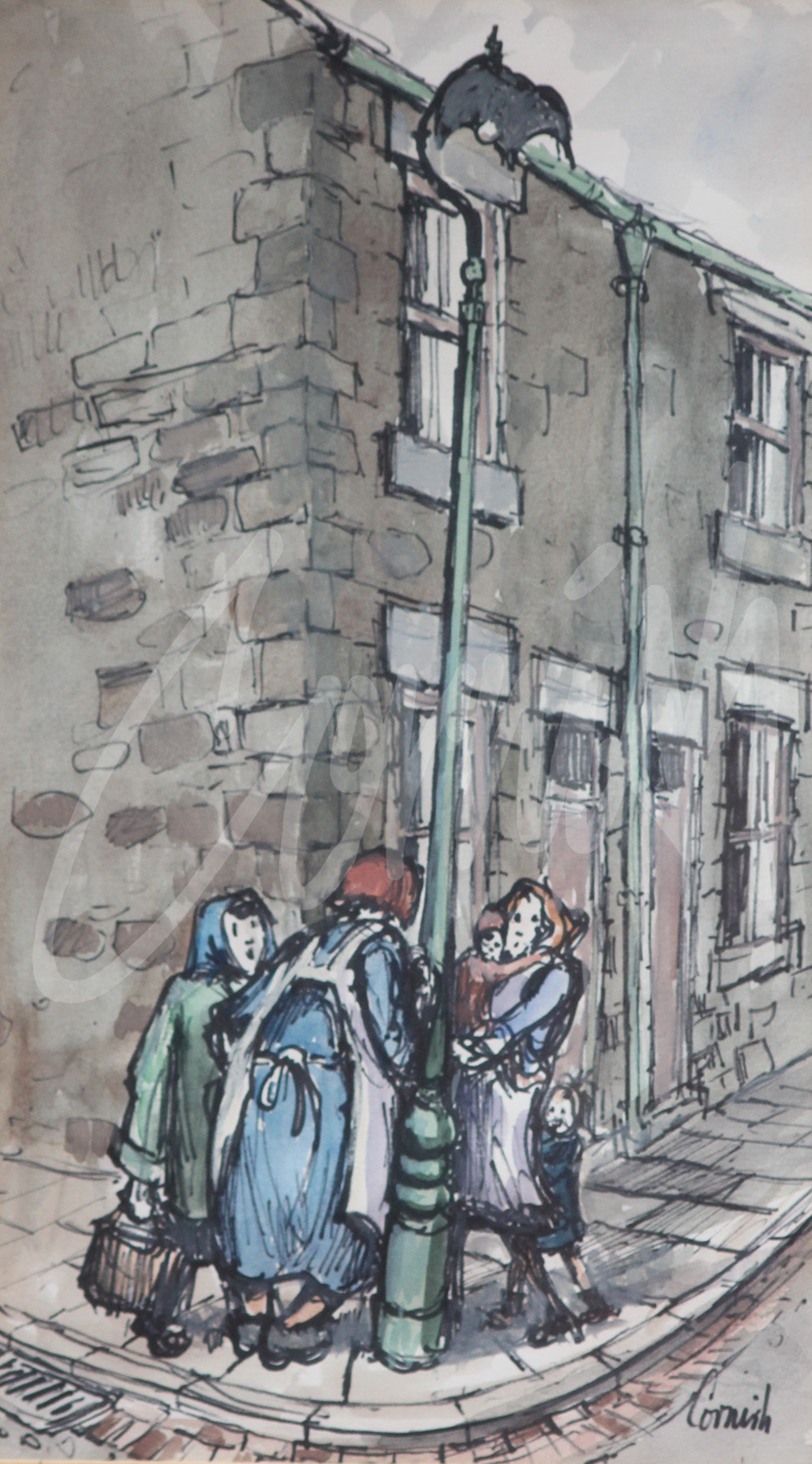 The post- war era was a period of rapid social change and art movements such as Cubism, Fauvism and Surrealism to name but a few, continued to evolve. Cubism was an early 20th Century style and movement in which perspective with a single viewpoint was abandoned and use was made of simple geometric shapes, interlocking planes and later collage. Cornish was well aware of these developments but declined to follow the popular trends. However, any aspiring artist in art school unwilling to follow ‘the trend’ was often ostracised by lecturers. This was the experience of John Peace, a contemporary of Cornish. Meanwhile, Cornish and Lowry continued to develop their own distinctive styles based around social realism, and without veering towards abstraction.