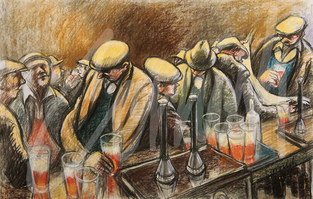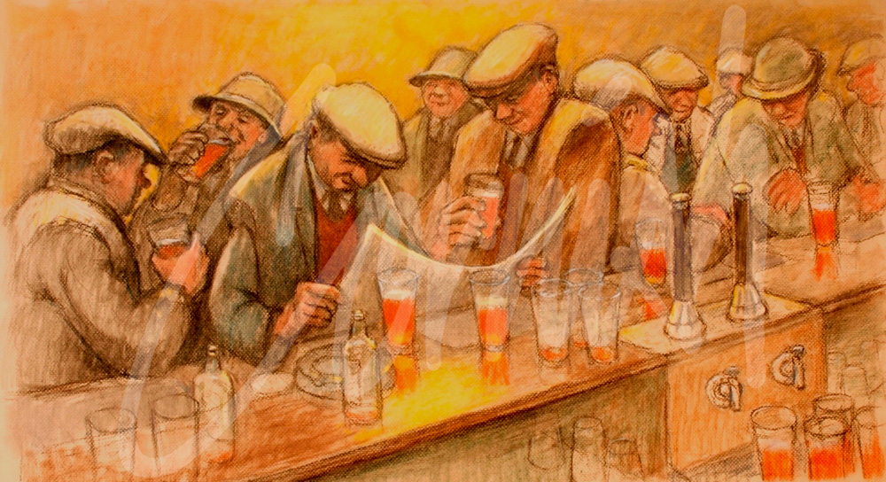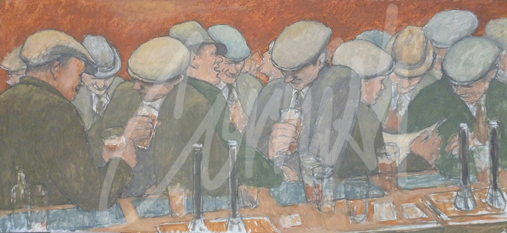 “I made drawings of pub interiors in days past because I was fascinated by the men standing at the bar drinking and talking, or playing dominoes. I also realised that life would change in some ways. Today people still drink in pubs but the atmosphere has changed.”