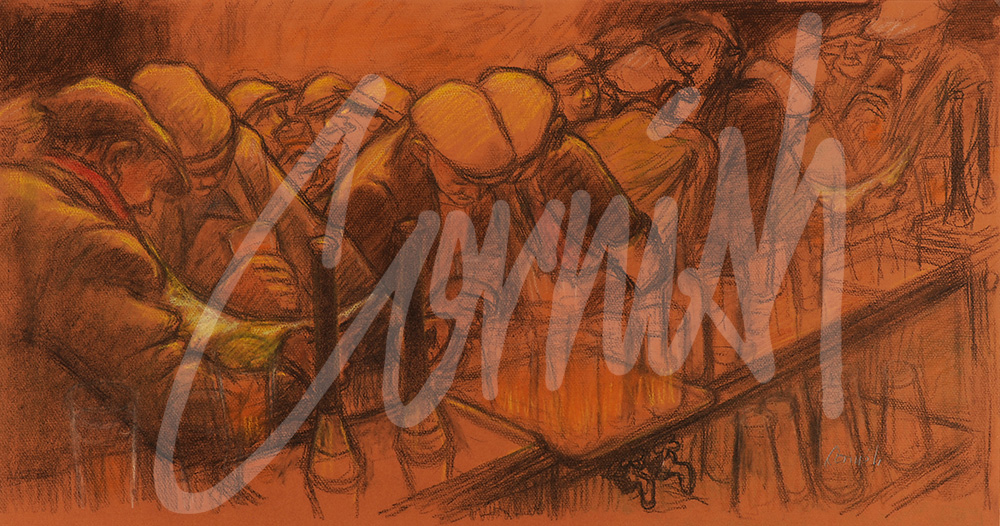 At one time there were over 35 pubs in Spennymoor and they became a favourite source of subject material for the drawings that became the foundation for his iconic ‘bar scenes.’ For over 30 years a miner by day, but with the eye of an artist at work observing ‘the things around him’ and his drawings and paintings eventually became a wonderful social record of his life and times in his era from the 1930s until the early 70s.
