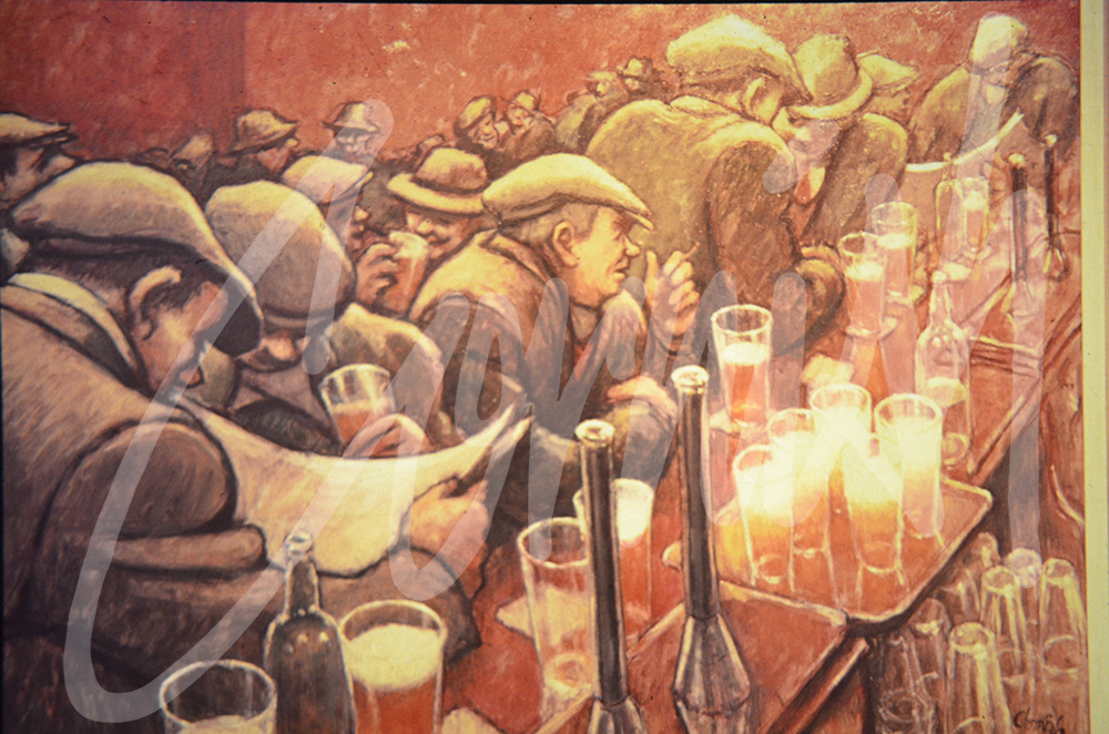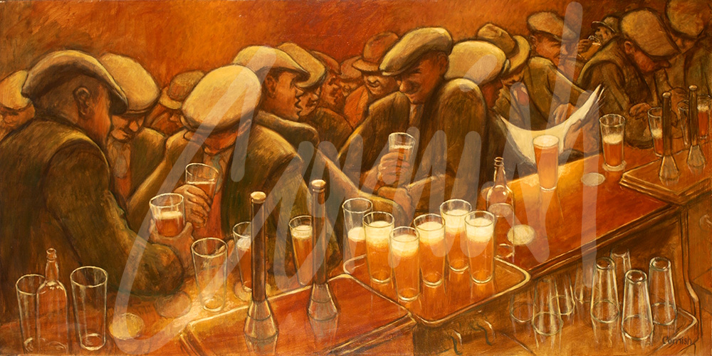 Finally, the rationale behind the classic composition with underlying principles was discovered written by Cornish on a scrap of paper in his studio. ‘Human drama based on gesture and attitude, monochromatic with the accent on atmosphere which contrasts the earthy humanism and mysterious glitter of the beer and the glasses.’ This just about sums it up !