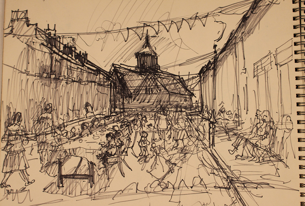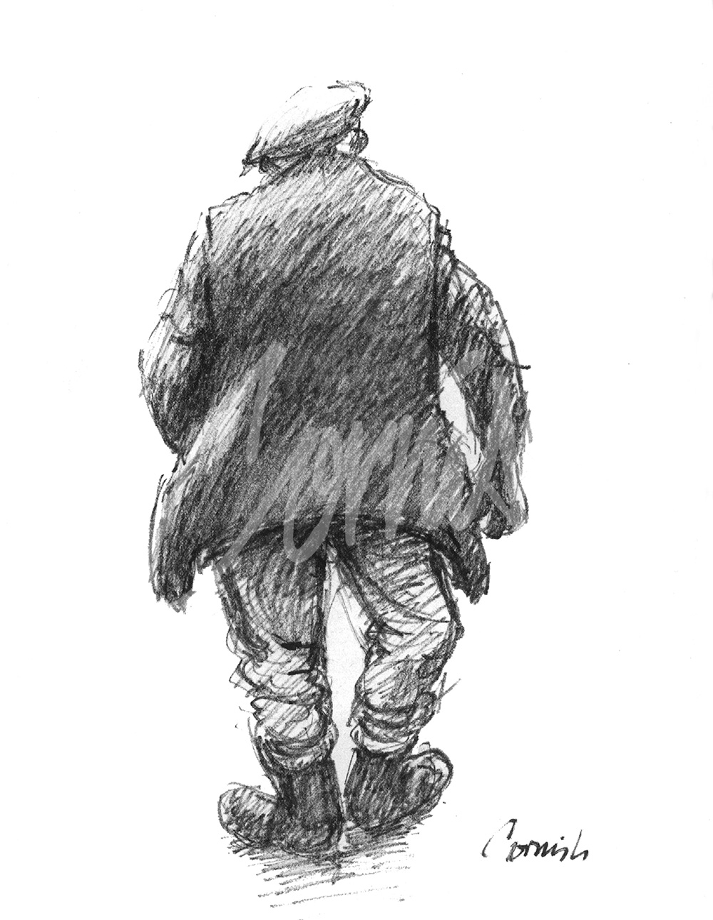 He produced hundreds of character studies, often in specific settings, at work, in pubs, on streets or people simply going about their daily lives. Moments quickly recorded that give us an aspect of heritage so familiar to many followers of Cornish’s work. His ability to work with speed and accuracy and to capture a moment in time was one of his strengths, using his Flo-master pen to great effect. A sketch book was a constant companion, kept in a ‘poacher’s pocket’ on the inside of a ‘donkey jacket’ along with his pen so that they were always immediately accessible.