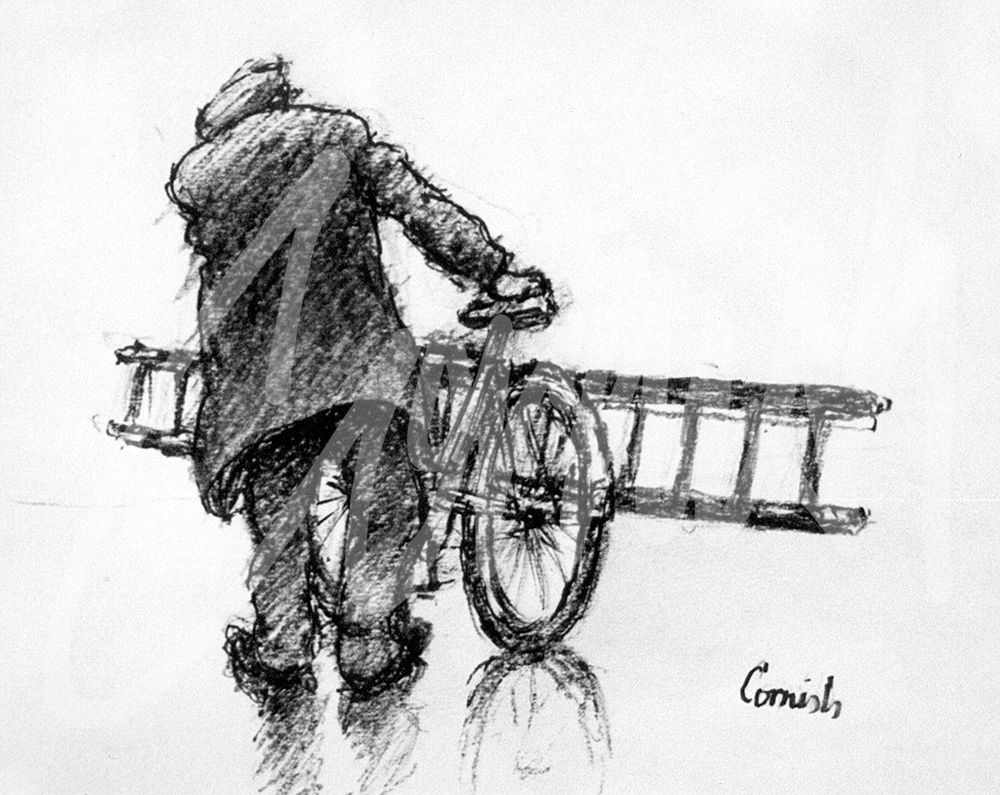 Subjects such as these often invoke many memories, and Cornish’s drawings are imbued with a sense of recognition of people and places, that help us to develop feelings of nostalgia and regional identity. Jackie Broomfield with his ladder or horse and cart could of course be typical of scenes replicated in different parts of the country at different times, and some other artists have attempted to imitate the same subjects.