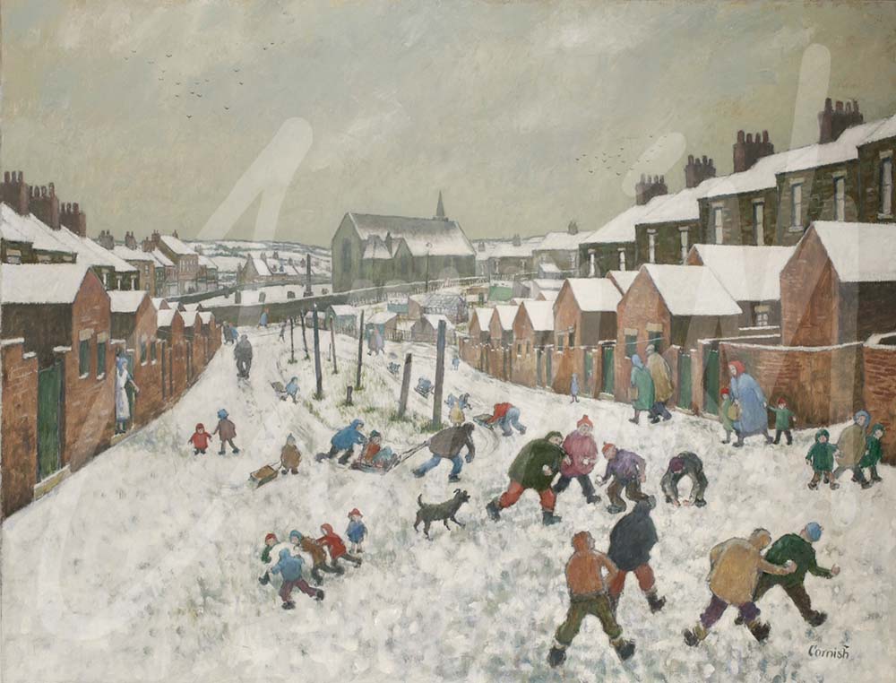 ‘Mount Pleasant in Winter’ is an excellent example of a popular subject which was a personal favourite of Cornish. The scene is featured in detail in ‘Behind the Scenes: The Norman Cornish Sketchbooks’ and it is accompanied by an account from Cornish regarding his thoughts about the composition and underlying concepts. The picture was also used by The Northern Echo to publicise their Christmas Magazine over 25 years ago and later, on the day of Cornish’s funeral, as a tribute, a full double- page spread in August 2014.